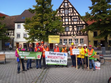 Der BN führte zum Thema „Rückbau von Asphaltstraßen“ am Samstag, den 16.9.2017 eine Aktion in Forchheim durch. Um 12:00h erfolgte zunächst ein Marsch des „Entsiegelungstrupps“ durch die Hauptstraße. Die dort befindlichen Parteien wurden an ihren Ständen mit der Forderung des BN nach mehr Bodenschutz konfrontiert. Es zeigte sich dabei weitgehende Übereinstimmung mit den Zielen der SPD und der Grünen Partei. Anschließend entfernte dieser Entsiegelungstrupp den Asphalt einer Fläche in der städtischen Peripherie (Globus-Gelände) mit Hilfe von Pickeln und Schaufeln als Symbol dafür, wie wichtig es ist, Boden als Teil der menschlichen Umwelt zu begreifen.