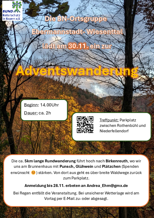 Die BN-Ortsgruppe Ebermannstadt-Wiesenttal lädt am 30.11.2025 ein zur Adventswanderung